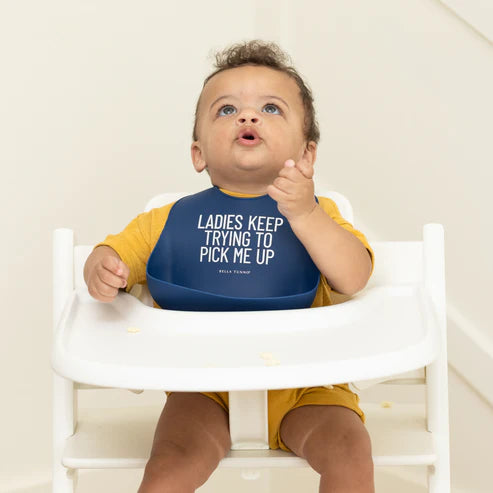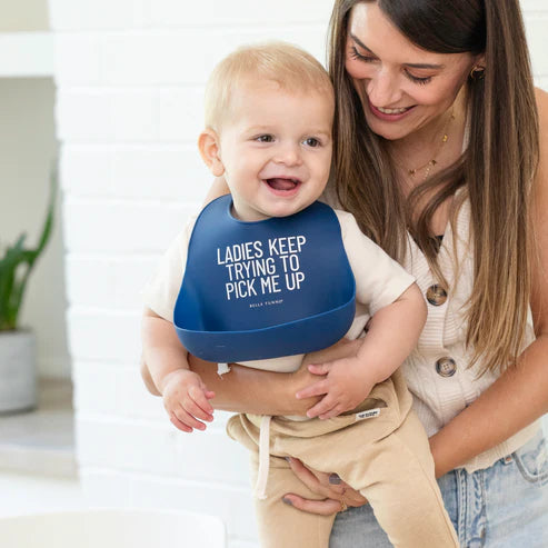 Flirty, funny, and functional, the Ladies Pick Me Up Wonder Bib is a silicone superstar that keeps mealtime messes under control—while bringing the laughs. With a generous catch pocket and adjustable fit, this bib is built to grow with baby and lighten the load for parents.