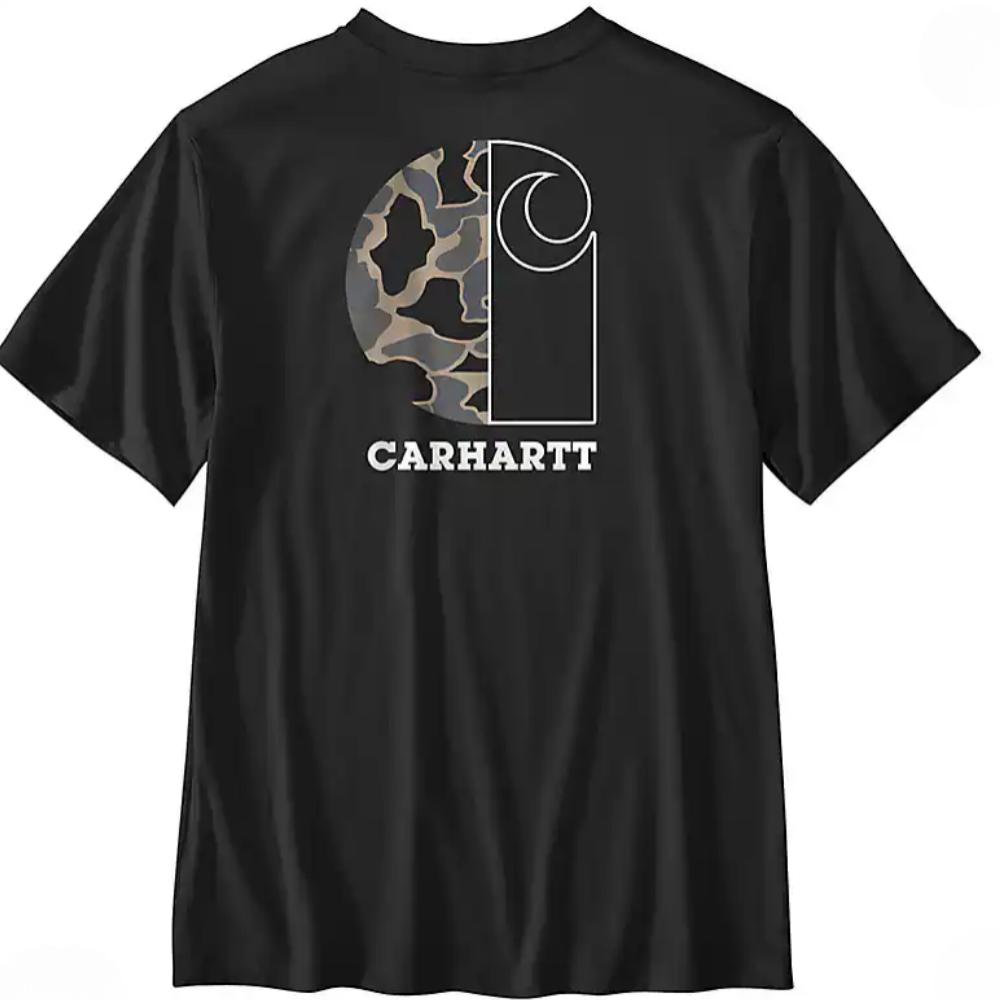 Signature Style – Left-chest pocket with Carhartt label and camo “C” back graphic