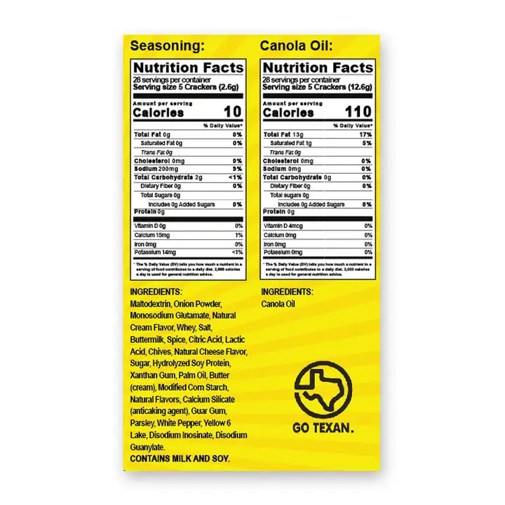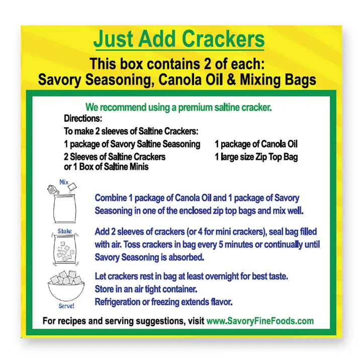 Each seasoning + oil combo makes 2 sleeves of crackers, so you can mix a half batch or go all-in for the full 4 sleeves.