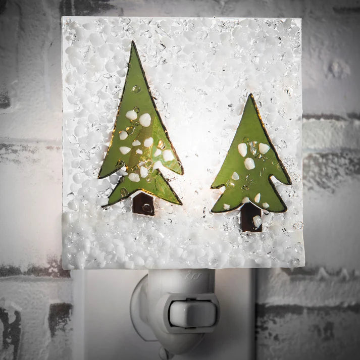 Capture the quiet beauty of winter with the Winter Pines Night Light. Featuring stately green pine trees dusted with falling snow, this handcrafted fused glass piece brings a serene and magical glow to any room. Both decorative and functional, it’s perfect for adding seasonal charm to your home or gifting to someone special.