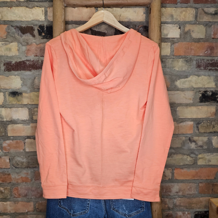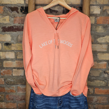 This lightweight long sleeve hoodie tee brings a soft, relaxed feel to your Lake of the Woods wardrobe. In a warm apricot shade, it features a casual V-neck with decorative tie-front detail and white “Lake of the Woods” lettering across the chest. It’s the perfect transitional layer for cool mornings, lake breezes, or lounging with a view.