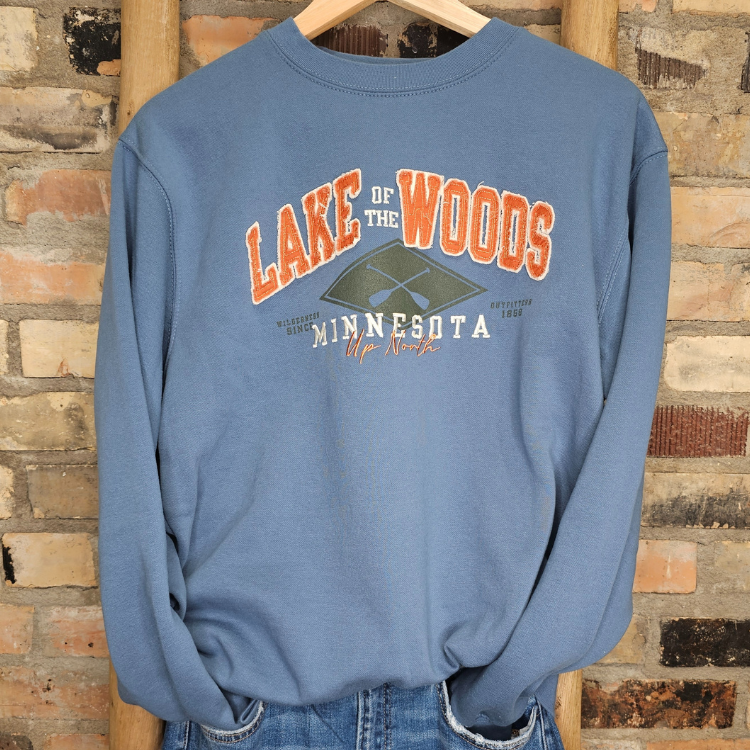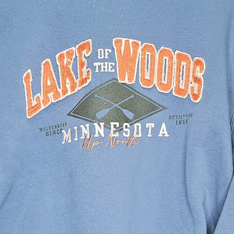 With a well-worn look and laid-back feel, the Lake of the Woods Heritage Crewneck brings all the charm of a weekend Up North. Vintage-style applique letters spell out Lake of the Woods across the chest, accented with a printed crossed-paddle design and subtle embroidery reading Minnesota Up North. Available in Baltic blue or classic Pewter, it’s the kind of sweatshirt that feels like a memory the moment you put it on.