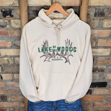 Wrap yourself in that classic Northwoods feel with this Lake of the Woods hoodie sweatshirt. Featuring a retro-inspired moose antler graphic and vintage-style lettering, this souvenir favorite blends rustic charm with laid-back comfort. Available in two versatile shades—athletic heather and sandstone—it's the perfect extra layer for cabin mornings, lakeside evenings, or chilly days Up North.