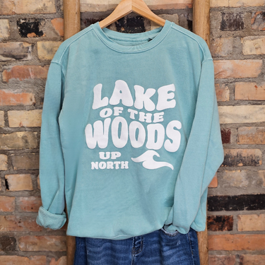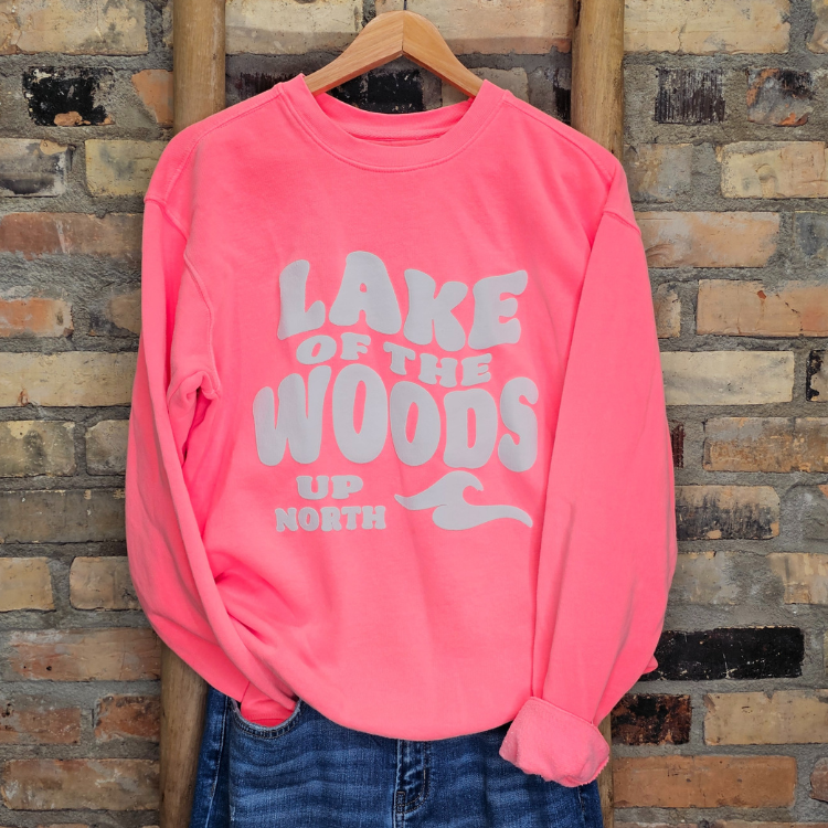 Summer vibin’ never looked so good. This Lake of the Woods crewneck brings the heat with puff lettering in a fun, funky font that reads Lake of the Woods and Up North—just the right mix of beachy and bold.