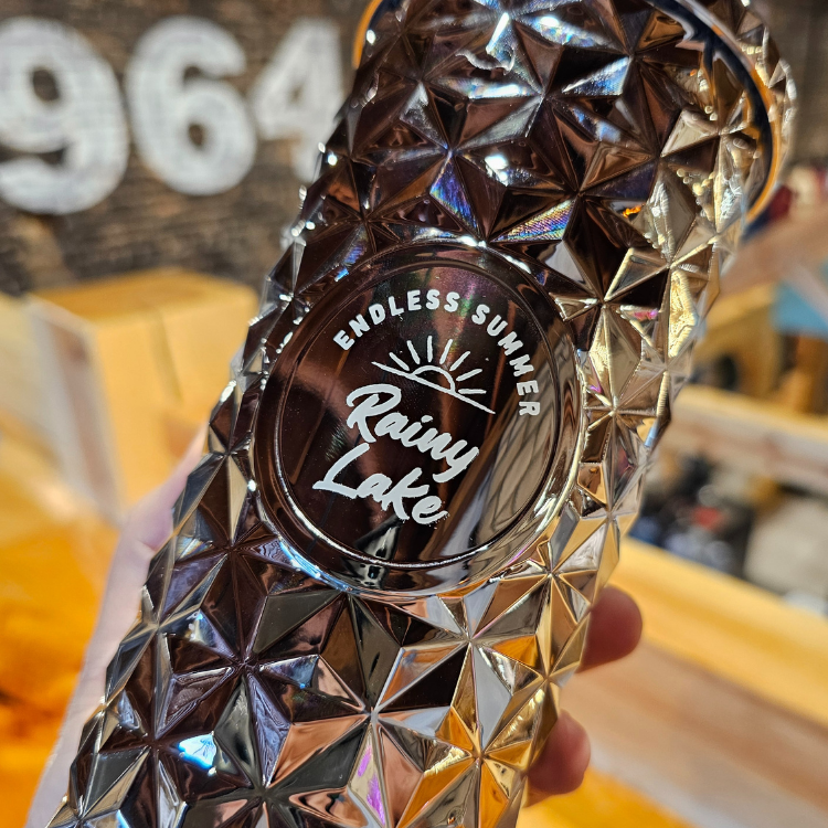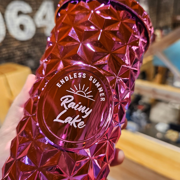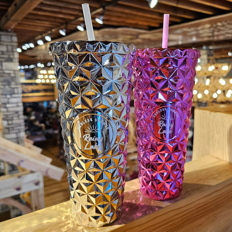 Add some shimmer to your sips with this reflective plastic tumbler featuring a cool hexagon prism texture and Rainy Lake printed design. The metallic finish comes in two colors - silver and pink - and catches the light for a fun, eye-catching look—perfect for lake days, road trips, or just brightening up your everyday hydration.