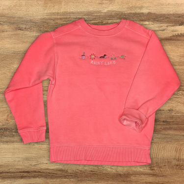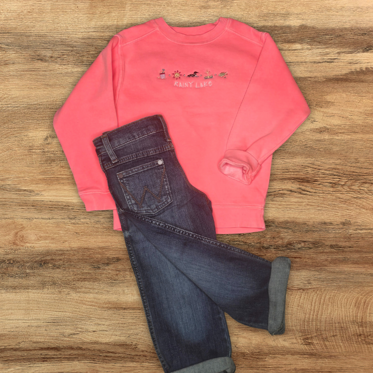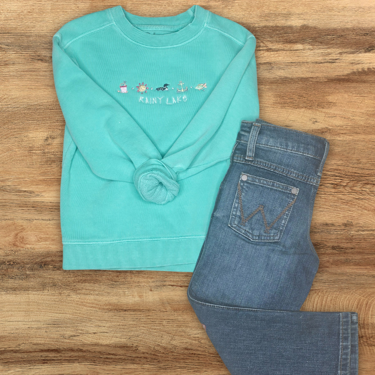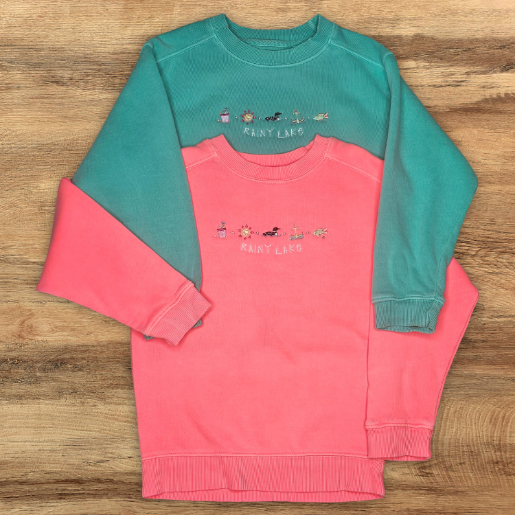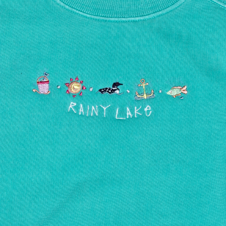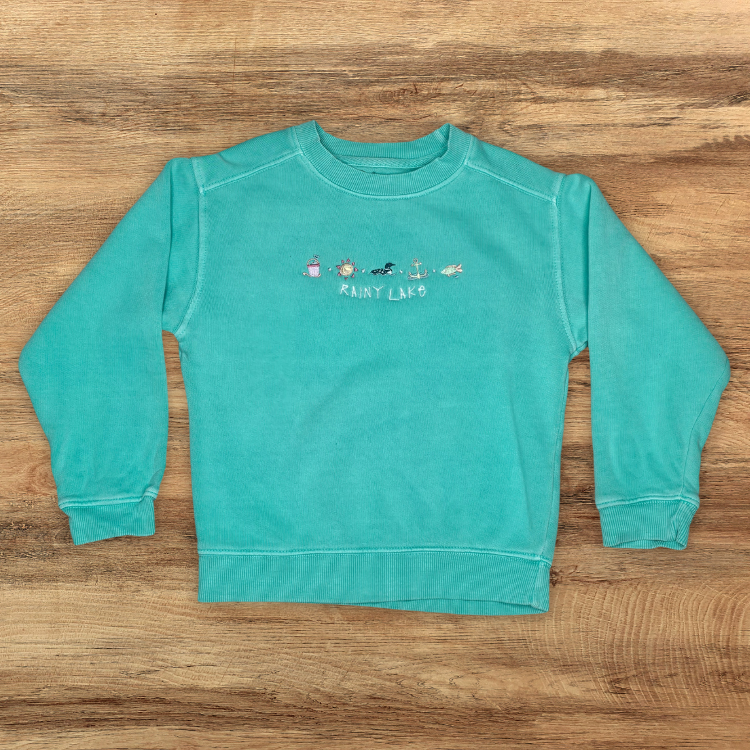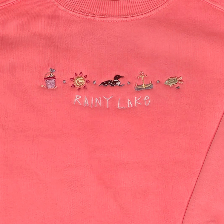 Bright, fun, and full of lake-day charm, this pigment-dyed kids' crewneck is made for summer adventures. Embroidered with Rainy Lake and a playful row of summer icons—a sand pail, sun, loon, anchor, and fish—it’s a cozy layer with all the joy of a day at the beach or on the boat.