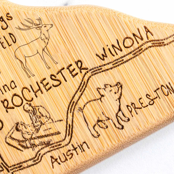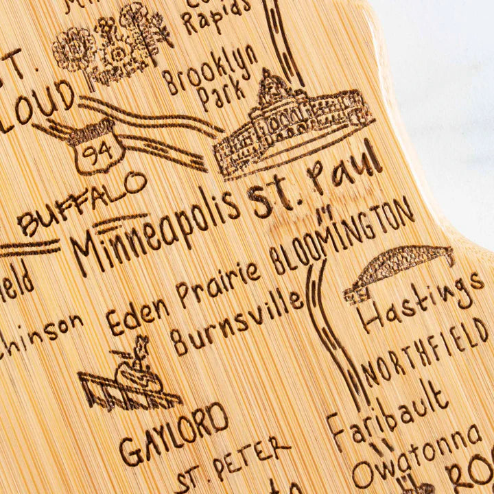 Show your Minnesota pride with this uniquely shaped bamboo cutting board! Part of the Destination Series, this board is crafted in the shape of the Land of 10,000 Lakes and features laser-engraved artwork highlighting beloved cities, towns, and landmarks across the state.