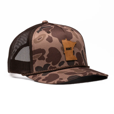 Designed for hunters, outdoorsmen, and Minnesota pride, the HUNT Minnesota Trucker Hat delivers standout comfort and timeless style. With a faux leather patch, pre-curved brim, and classic rope detail across the bill, it’s the cap you’ll reach for day after day—whether you're in the field or around town.