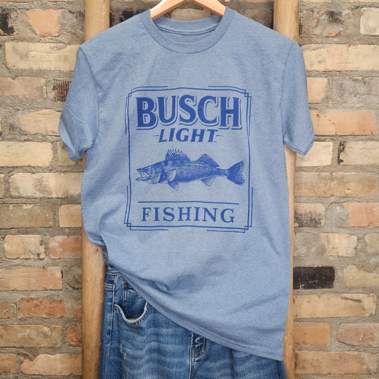 Whether you're casting lines or cracking a cold one, this Busch Light Walleye Fishing tee is built for good times and great catches. Featuring a bold walleye graphic and fishing text alongside the iconic Busch Light logo, this soft, lightweight shirt is ready for the lake, the cabin, or just dreaming about both. Available in Heather Indigo and Graphite Heather.