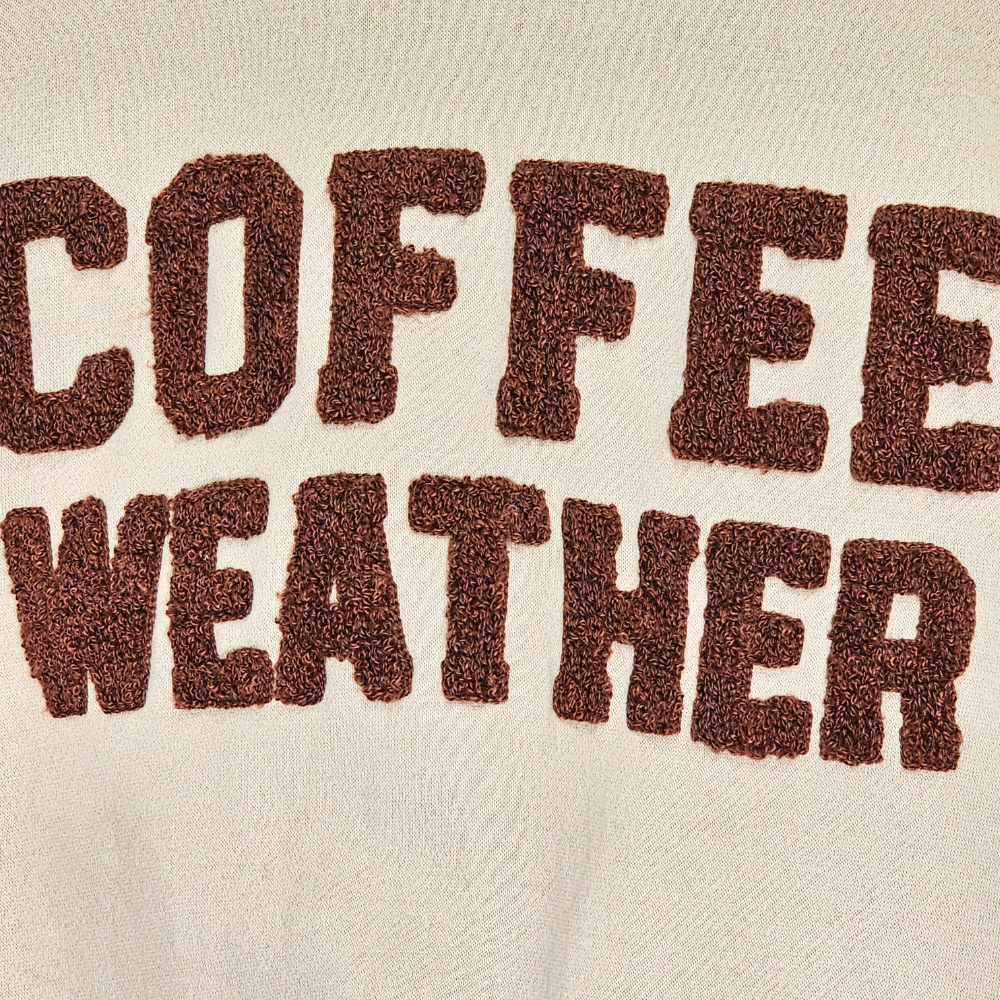 Fun “Coffee Weather” chenille applique with varsity-inspired texture