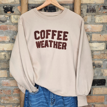 Bring on the crisp mornings and cozy vibes with the Coffee Weather Crewneck Sweatshirt. Featuring a bold chenille applique that feels just like the classic varsity patches on letterman jackets, this sweatshirt gives a playful nod to nostalgic style while keeping you warm and comfortable. Perfect for coffee runs, lazy weekends, or layering on brisk fall days.