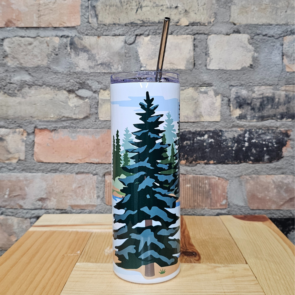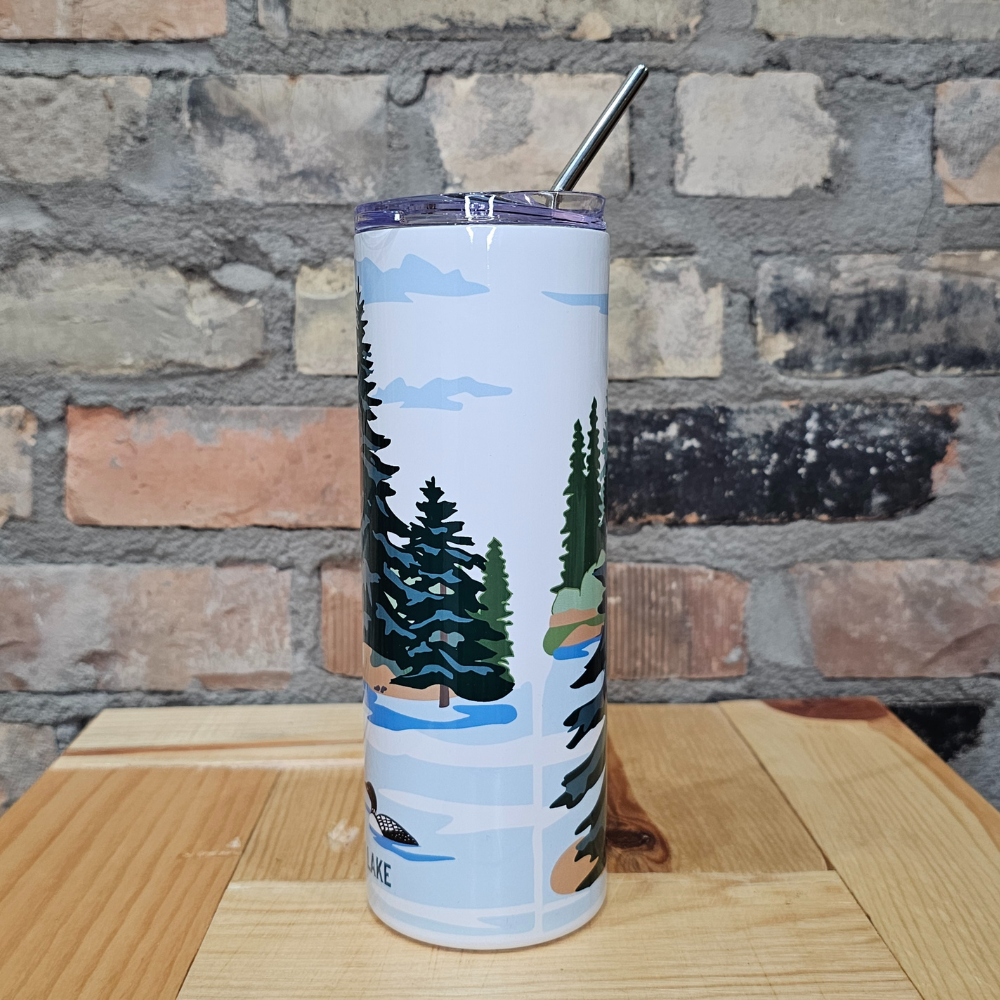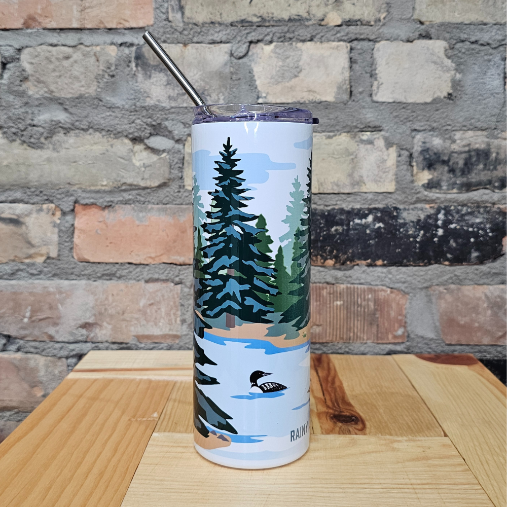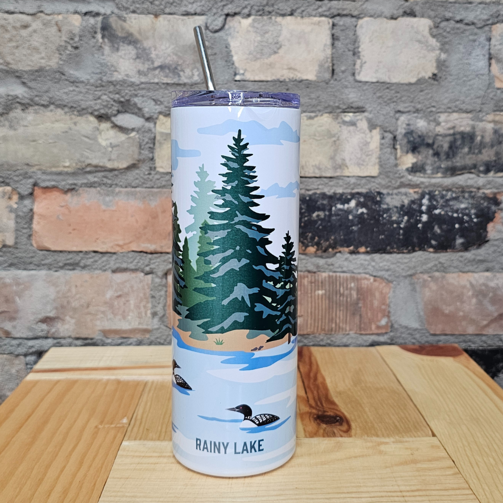 Bring the beauty of Rainy Lake wherever you go with this tall travel tumbler. Featuring loons gliding across the water, surrounded by trees and a golden sun, this design captures the peaceful charm of northern Minnesota. The sleek white background makes the artwork pop, while the stainless steel straw and clear lid make it perfect for sipping your favorite hot or cold drinks on the move.