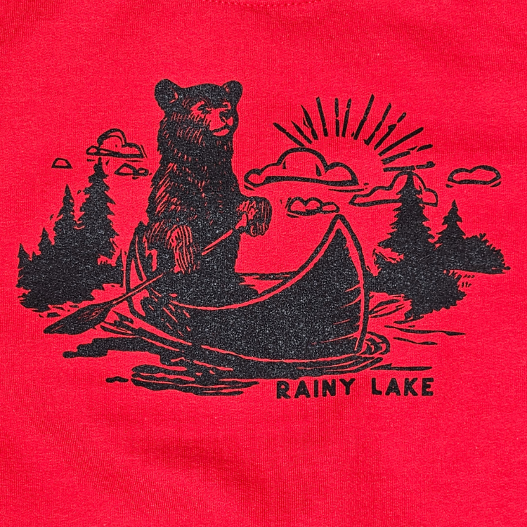 This cozy kids’ sweatshirt brings the fun of Rainy Lake to life with the throwback souvenir design of a playful bear fishing from a canoe. Available in bright red or royal blue, it’s the perfect keepsake for your little adventurer—whether lakeside or dreaming of the next trip north.