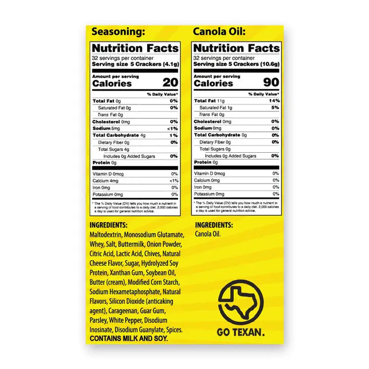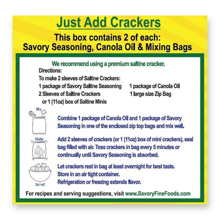 Each kit includes two complete sets of pre-measured seasoning and oil packets, plus mixing bags—just add your favorite saltines and shake! Each set makes 2 sleeves of crackers, for a total of 4 sleeves per kit.