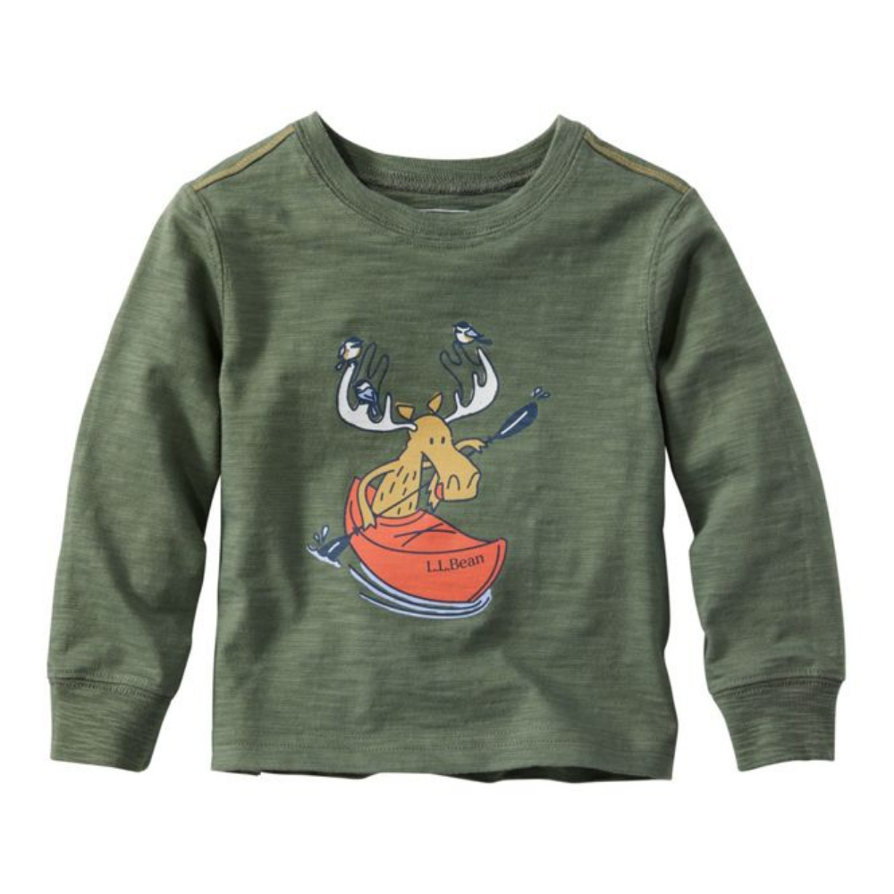 The L.L.Bean Infants’ and Toddlers’ Long-Sleeve Glow-in-the-Dark Graphic Tee brings the joy of outdoor adventure to life with a whimsical design featuring a cute moose paddling a canoe. The canoe’s bow proudly displays “L.L.Bean” in script, making this tee as charming as it is comfortable. Kids will delight in seeing the scene glow after dark, while parents appreciate the durable construction, lasting color, and all-day softness. Perfect for little explorers who love playtime—day or night.