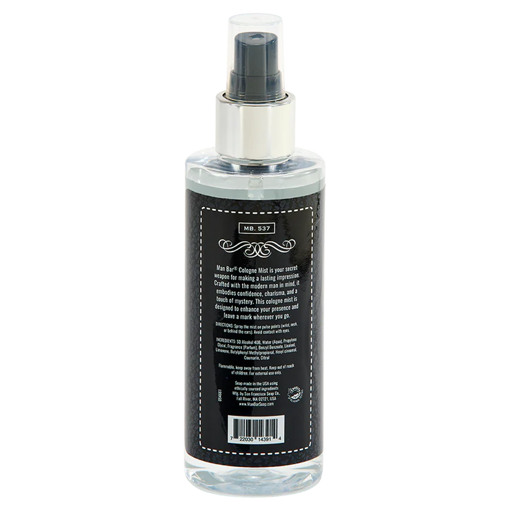 back of MAN BAR® Cologne Mist – Midnight Amber bottle on white background back of MAN BAR® Cologne Mist – Midnight Amber bottle on white background
