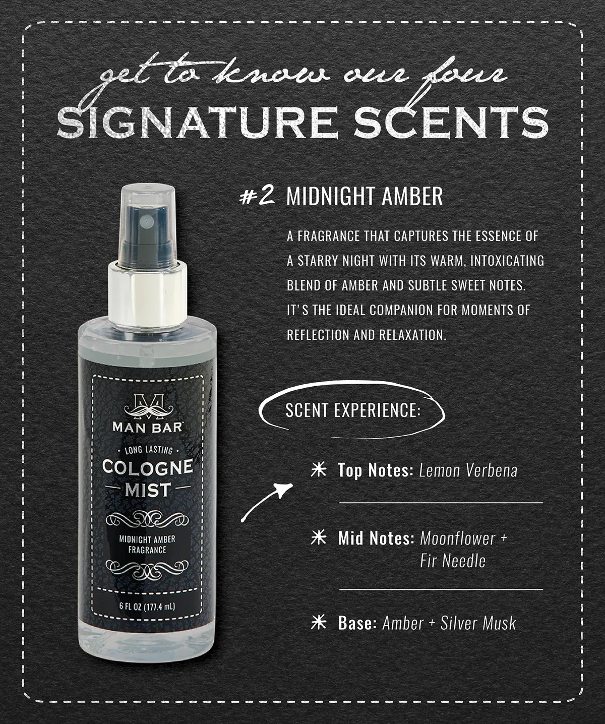 Cologne mist bottle with description of 'Midnight Amber' scent on a dark background Cologne mist bottle with description of 'Midnight Amber' scent on a dark background