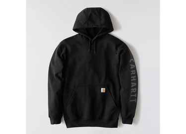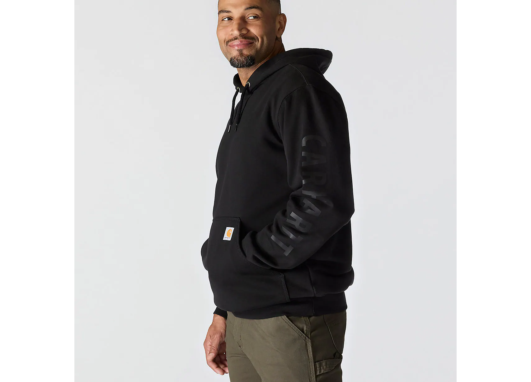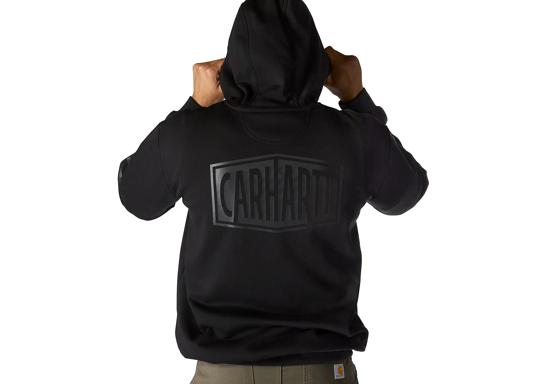Versatile midweight warmth and familiar cotton-blend fleece comfort. This men's graphic hoodie has the added benefit of Carhartt Rain Defender® for resisting damp weather. A loose fit allows for easy layering and unrestricted movement.