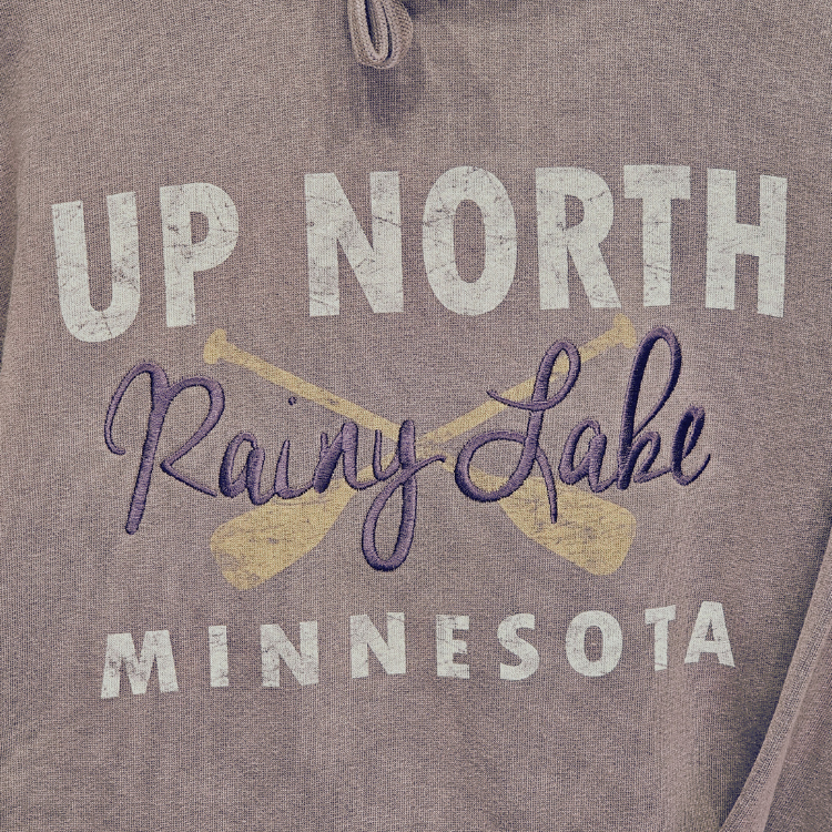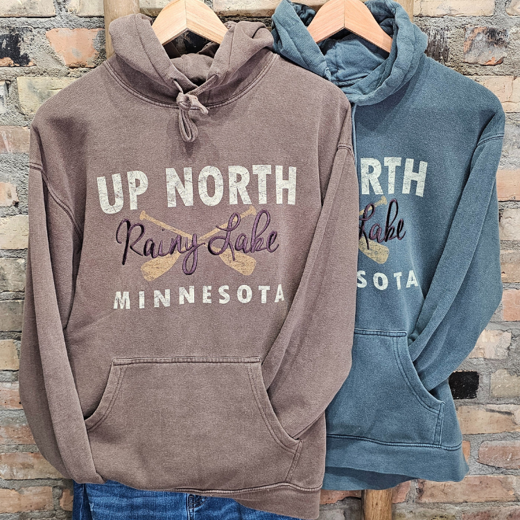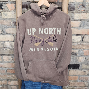 Laid-back and lake-ready, this hoodie brings all the Up North energy. With a soft vintage-wash finish in your choice of coffee or forest green, it blends classic style with cozy comfort. A bold Up North graphic and Minnesota print give it a nostalgic outdoorsy feel, while the embroidered Rainy Lake and crossed canoe paddles seal the deal. It’s everything a favorite hoodie should be—soft, relaxed, and full of Northwoods charm.