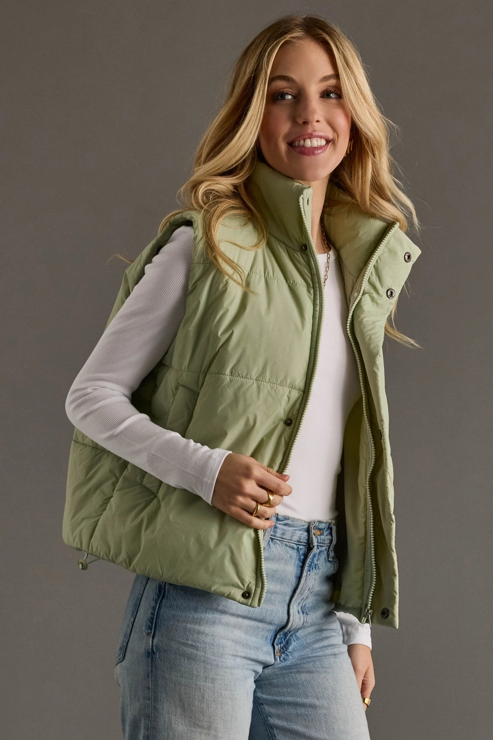This Light Sage Vest features a soft, lightweight puffer design with a zip and snap-button closure, high neck, and side pockets for a cozy, relaxed fit perfect for layering through any season.
