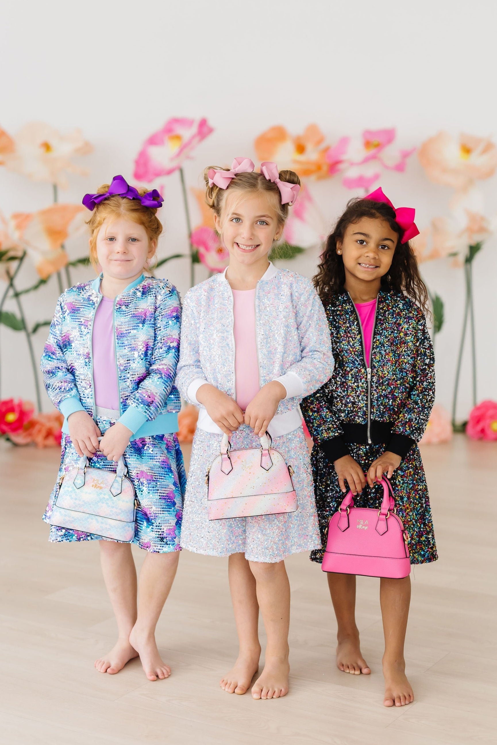 You asked, we listened!  Our sequin twirl skirts are back and better than ever, but this time with attached SHORTS.  Mix and match with our tees and jackets to sparkle up any outfit!  Perfect for birthdays, holidays, and special occasions.  This skort adds the perfect amount or shine to any outfit. Also available in a matching Jacket.