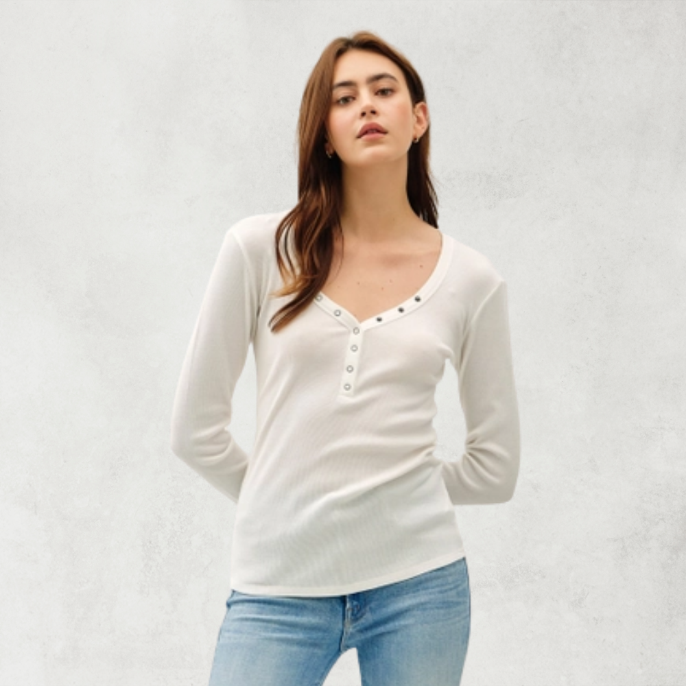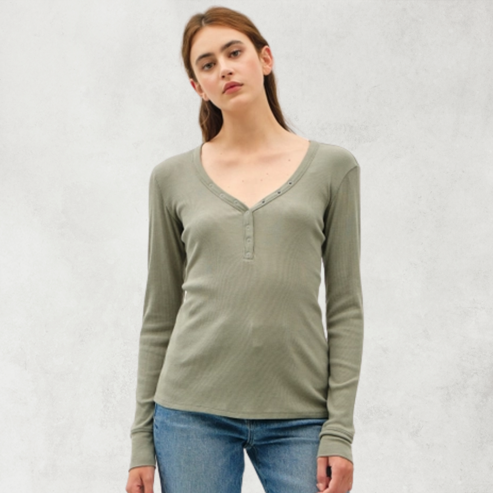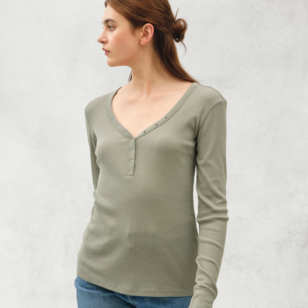 Style: Ribbed Cotton Henley Snap Button Neck Top