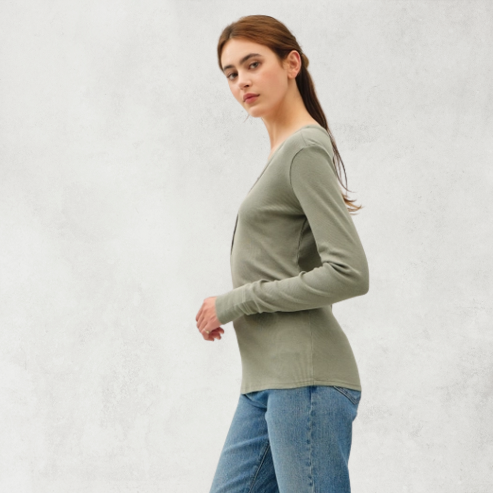 Meet your new go-to essential: the Ribbed Cotton Henley Snap Button Neck Top. With its soft, stretchy ribbed fabric and classic Henley neckline, this long sleeve basic is as versatile as it is comfortable. Designed with a relaxed slim fit and cuffed sleeves, it’s perfect for layering or wearing solo, making it a timeless piece for every wardrobe. Available in olive, black, and off-white.