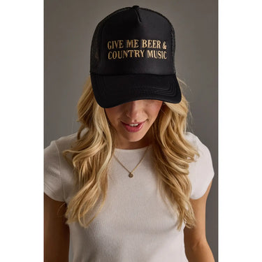 This black trucker hat featuring tan embroidered lettering that reads "Give Me Beer & Country Music" made from durable polyester with an adjustable snapback closure for the perfect country-inspired fit. 100% Polyester.