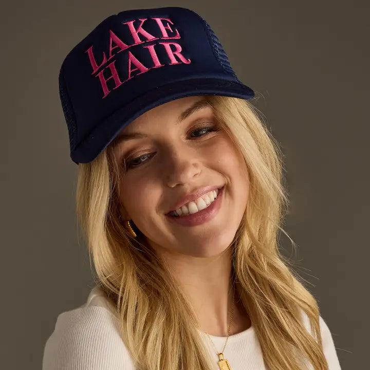 For mornings on the dock, afternoons on the boat, and everything in between—this playful trucker hat is made for lake days and low-maintenance hair. Featuring pink Lake Hair embroidery on a classic navy background, it’s breathable, adjustable, and full of laid-back charm.