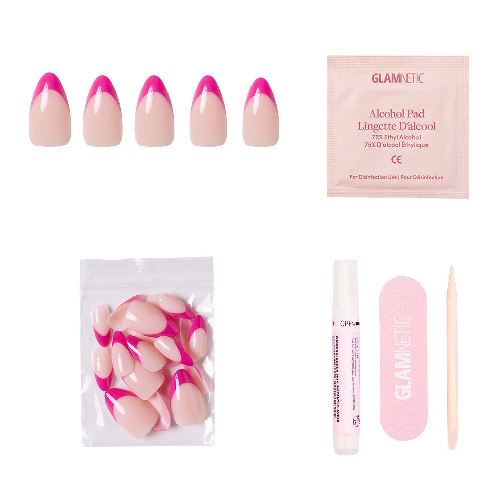 Raspberry Sorbet makes a statement with vivid magenta-pink French tips on a semi-translucent base for a bold yet effortlessly chic look. Designed in a flattering short almond shape, this set adds just the right amount of personality while maintaining that polished, French-girl feel. The UV finish enhances shine and durability, making it a striking option for daily wear or special occasions.