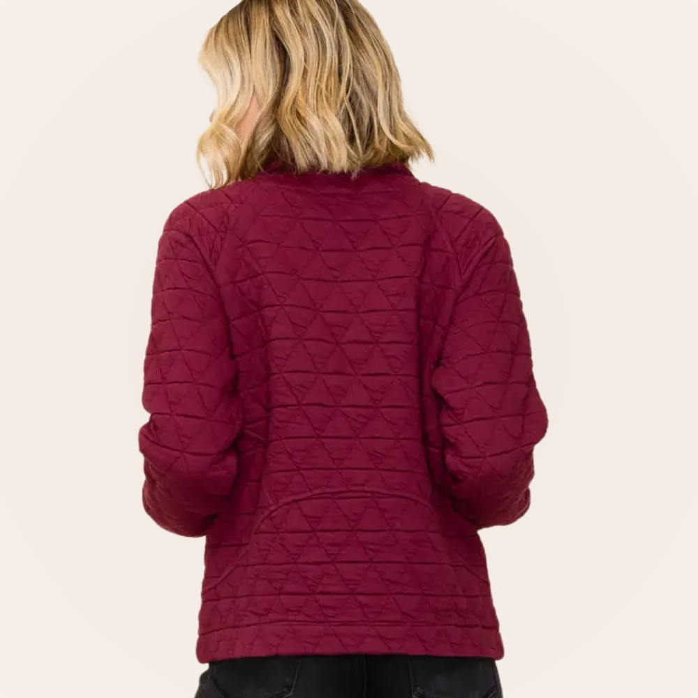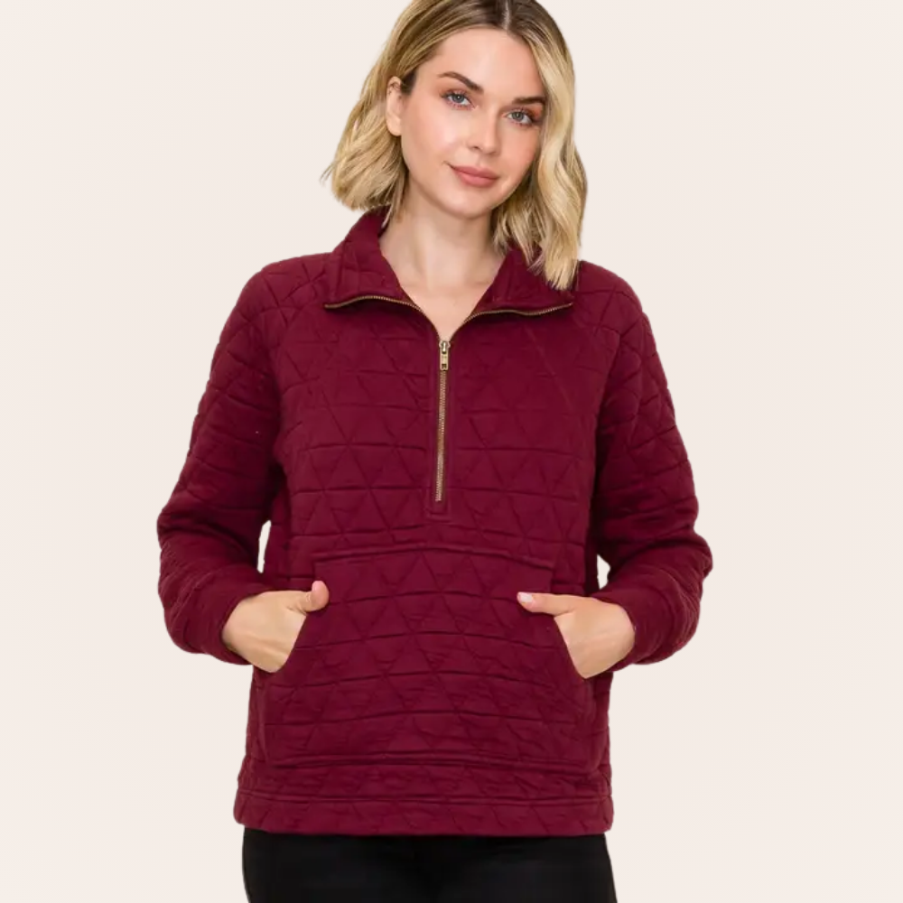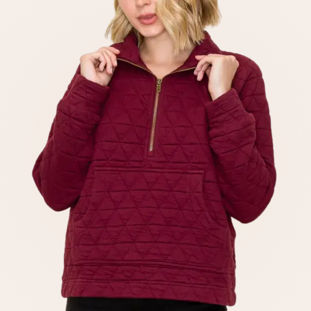 Elevate your cozy layers with the Half Zip Quilted Sweatshirt, designed in a rich burgundy color. Featuring a polar neck, quilted knit texture, and a half-zip front, this pullover strikes the perfect balance between casual comfort and polished style. A roomy kangaroo pocket adds both function and laid-back charm, making it your new go-to for everyday wear.