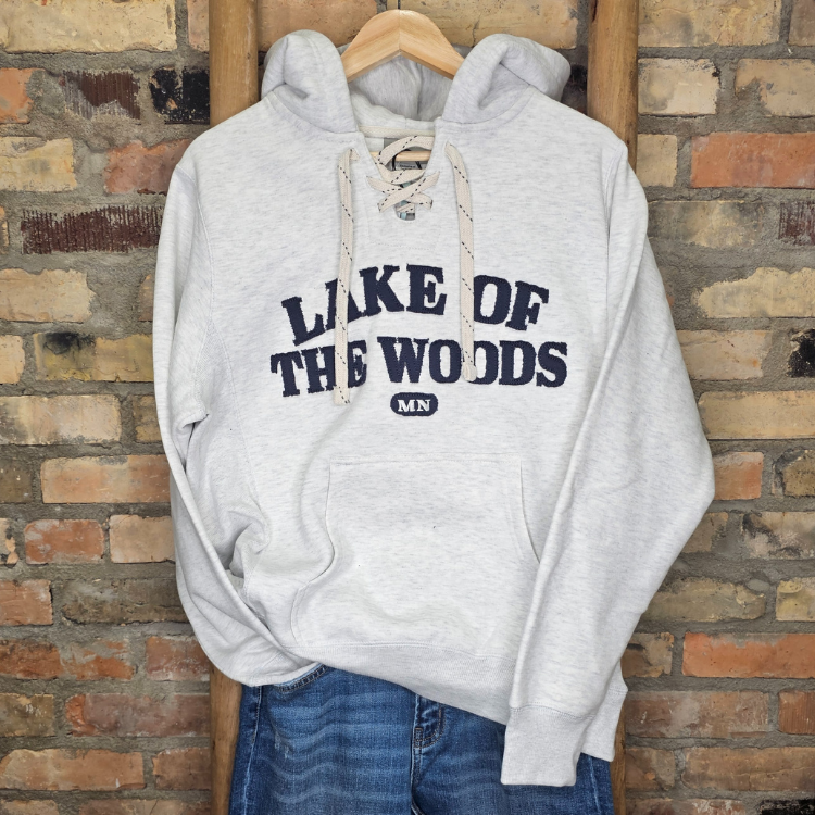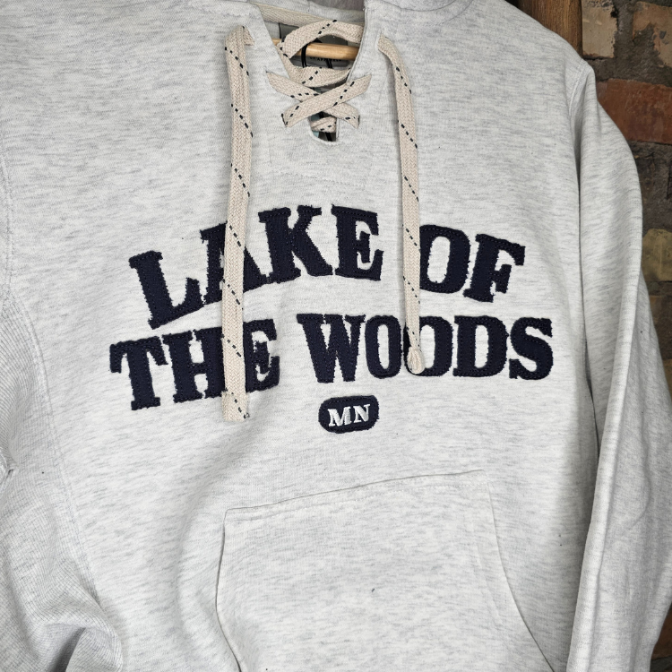 This heavyweight hoodie brings classic hockey style to the great outdoors. Featuring a lace-up neckline, soft fleece interior, and bold “Lake of the Woods” navy blue applique across the chest, this ash grey sweatshirt is built for warmth, comfort, and local pride. It’s a cozy nod to one of Minnesota’s most iconic lake destinations.