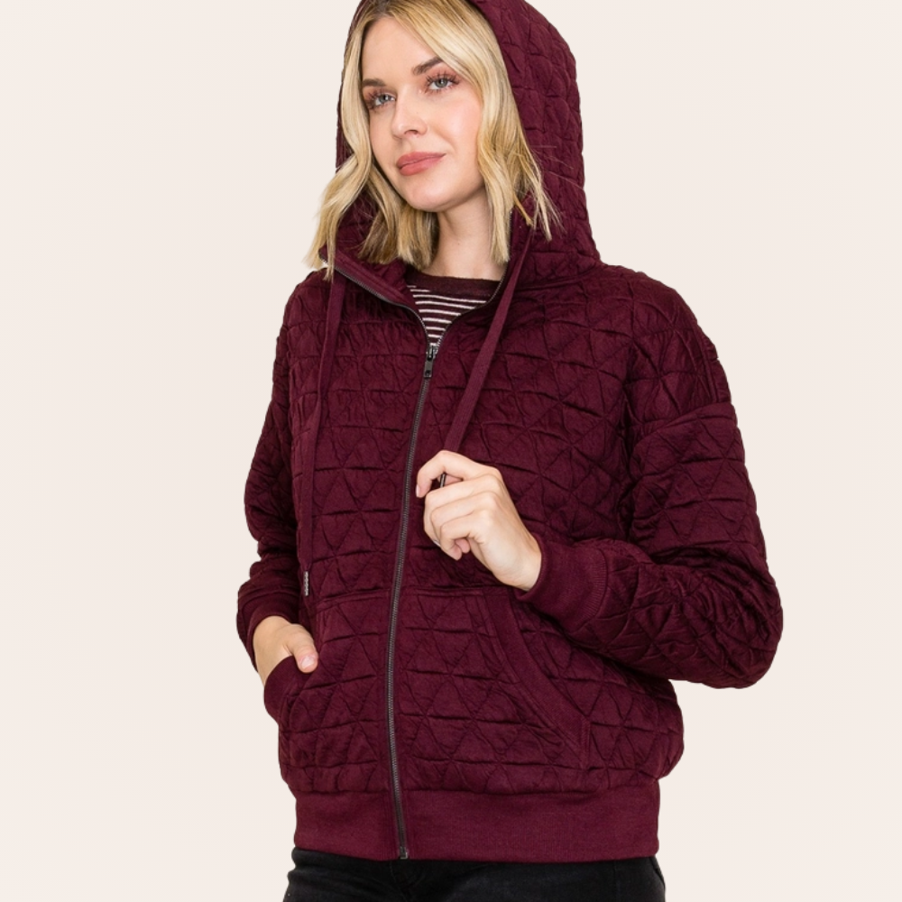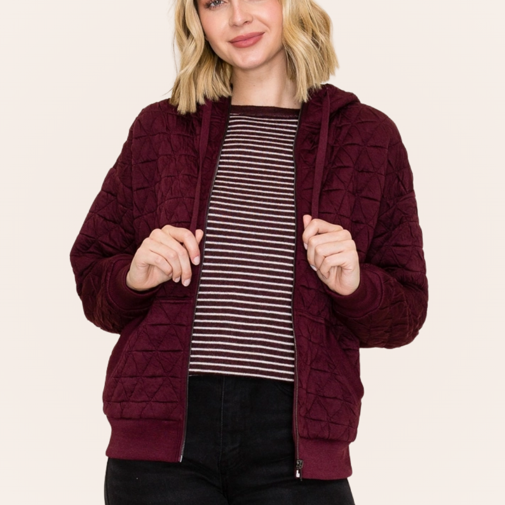 Stay cozy and stylish in the Quilted Zip-Up Hoodie Sweatshirt Jacket, designed in a gorgeous red wine color. Featuring a quilted knit texture, long sleeves, and practical front pockets, this hoodie combines laid-back comfort with a touch of elevated style. The shoelace drawstring adds a casual detail, while the zip-front closure makes it easy to layer over your favorite tops.