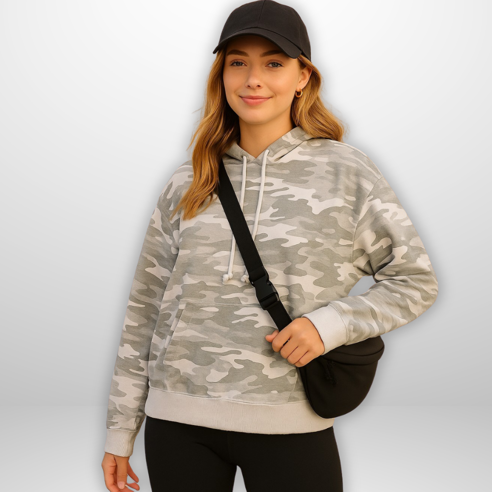 Stay cozy and stylish with this lightweight camo hoodie. Featuring soft grey and white tones for a fresh twist on the classic camo print, it’s designed with a relaxed fit and all the essentials: drawstring hood, long sleeves, and a roomy front pocket. Perfect for layering, lounging, or casual everyday wear.