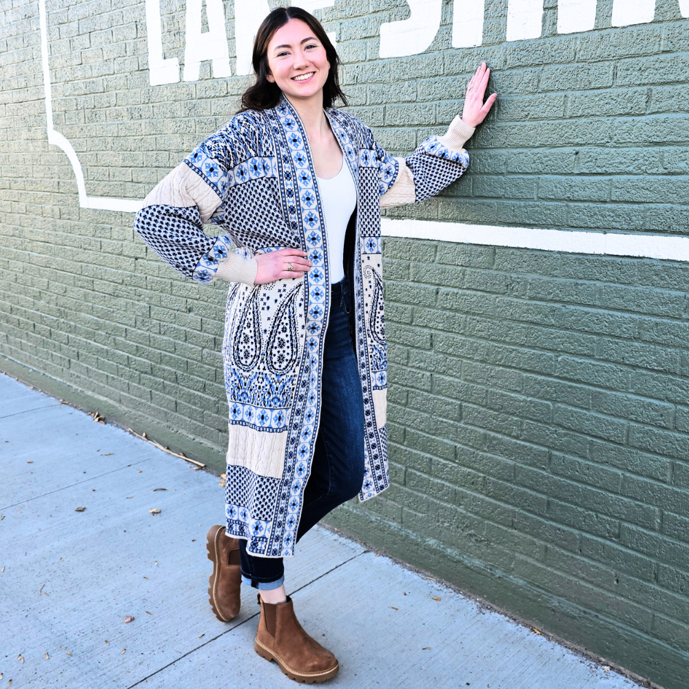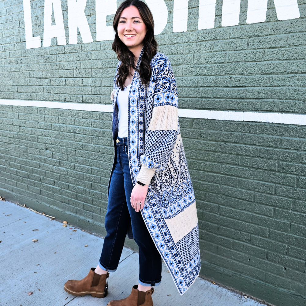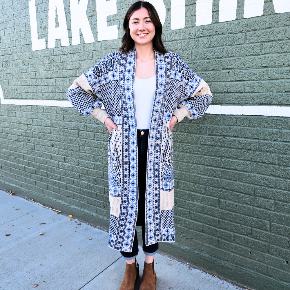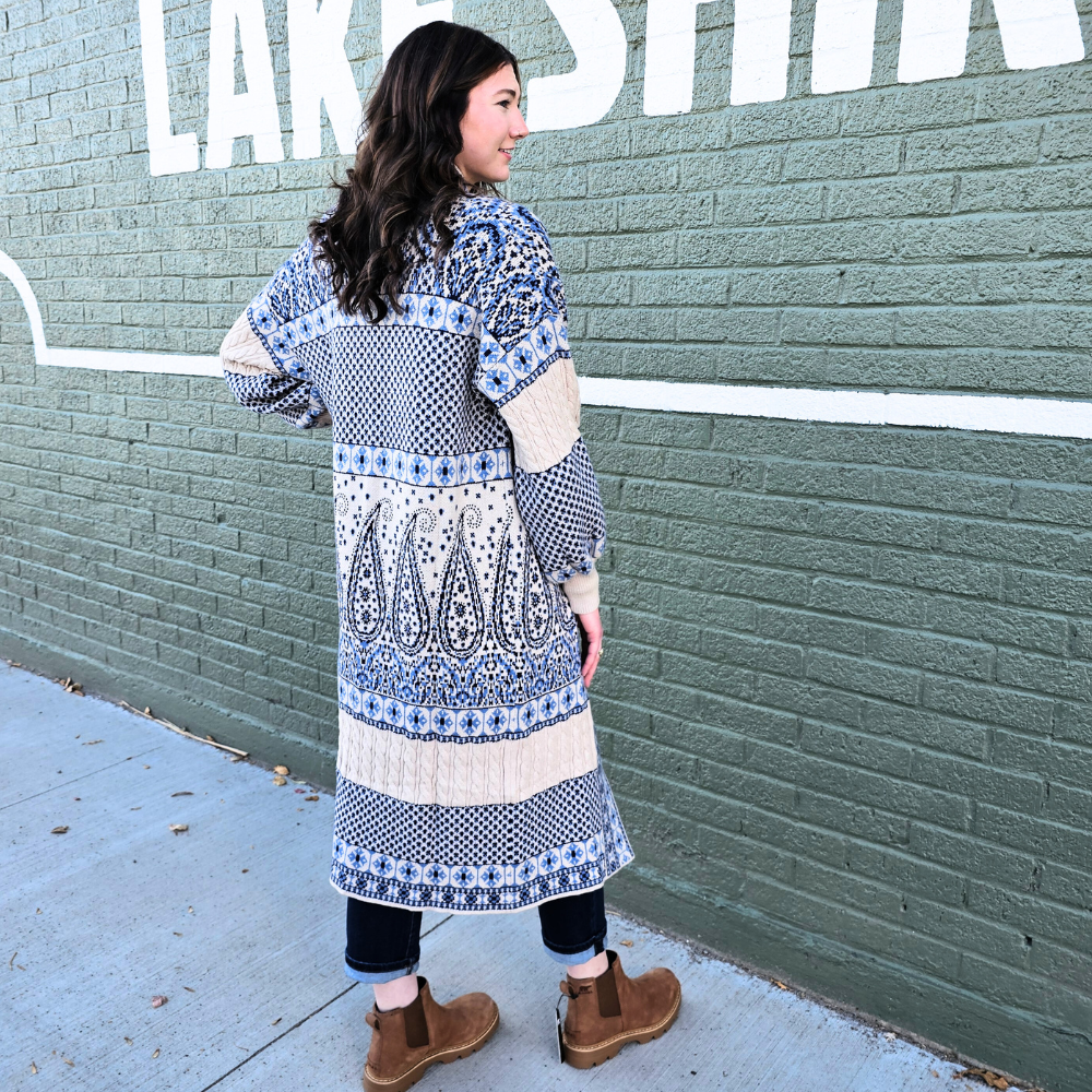 Meet the coatigan that does it all—our Blue & White Paisley Coatigan combines the ease of a cardigan with the polish of a coat. The knit fabric drapes beautifully with just the right bounce, while the timeless paisley print in soft blue and white gives it an elevated, feminine touch. Long and open-front, it’s the versatile piece you’ll love slipping on whether you’re headed out or staying in.