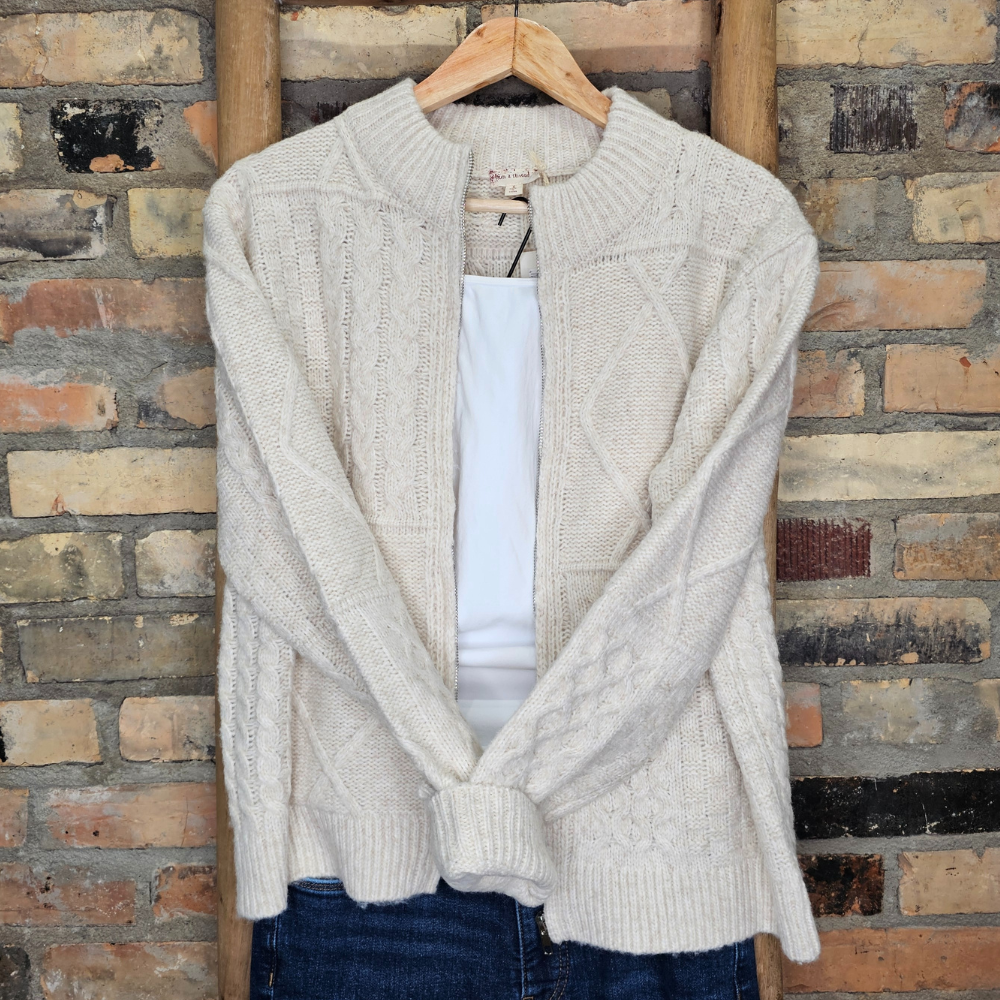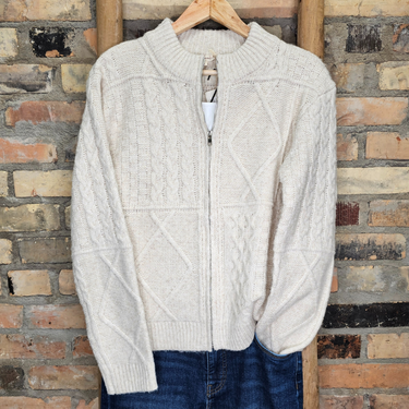 Here’s a sweater that blends timeless design with cozy comfort. Crafted in a soft textured knit that combines fisherman and cable-inspired patterns, this full-zip sweater in a neutral oatmeal tone is as versatile as it is stylish. The mock neck collar and hip-length cut make it an easy grab-and-go layer that works dressed up or down.