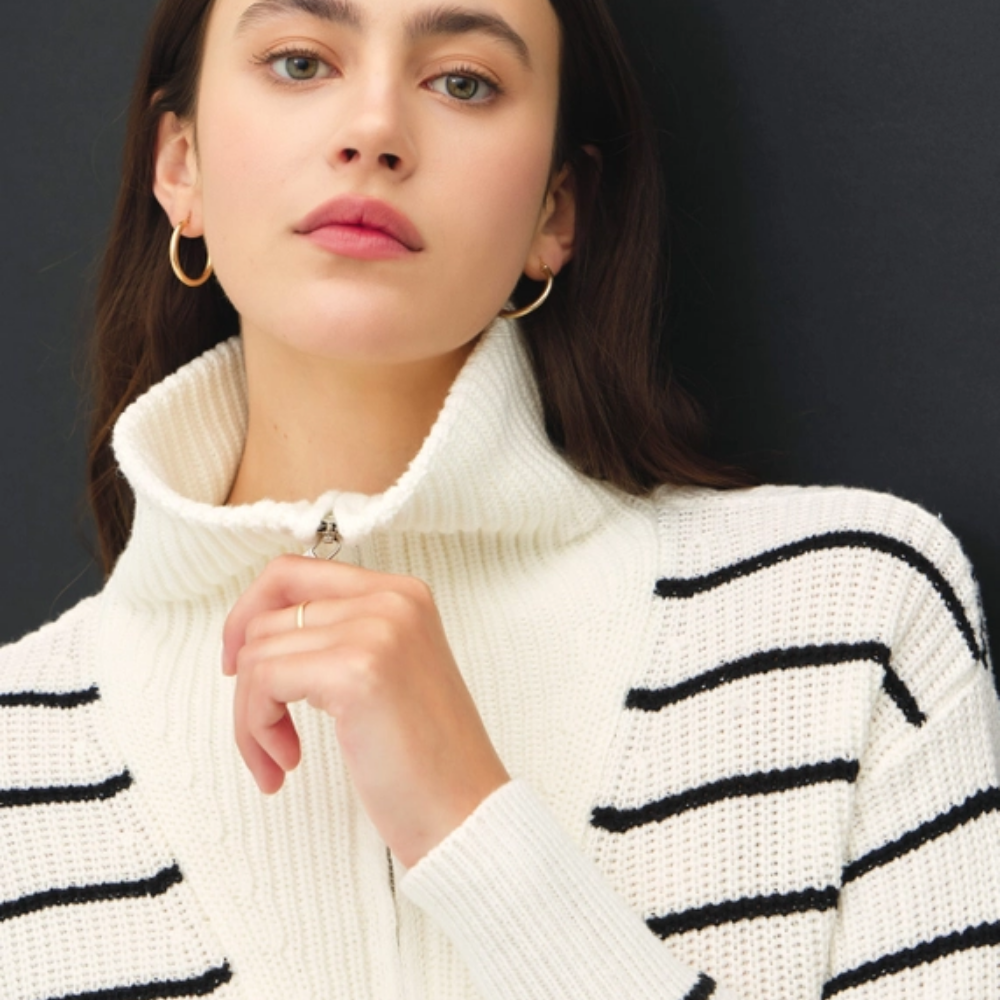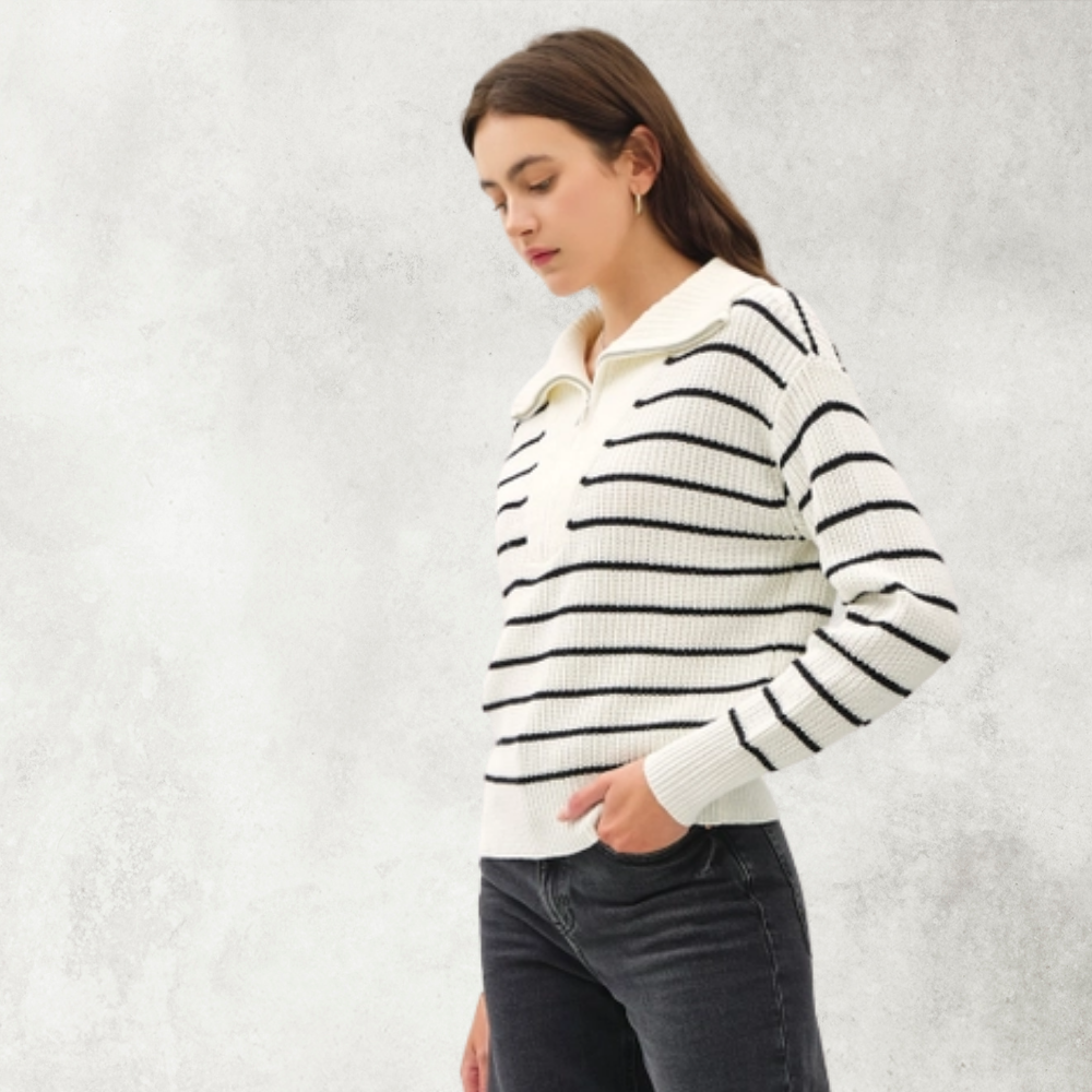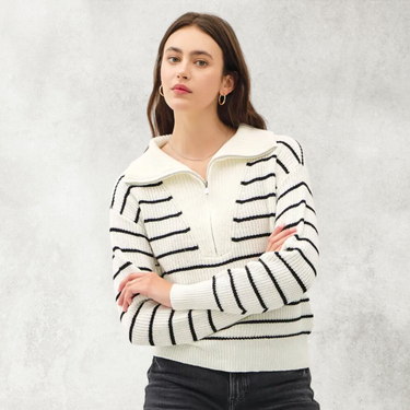 Classic with a modern twist, the Spread Collar Half Zip Striped Sweater brings effortless style to cool-weather dressing. Featuring a ribbed cotton knit, bold stripes, and a spread collar with a half-zip neckline, this piece blends preppy charm with everyday comfort.