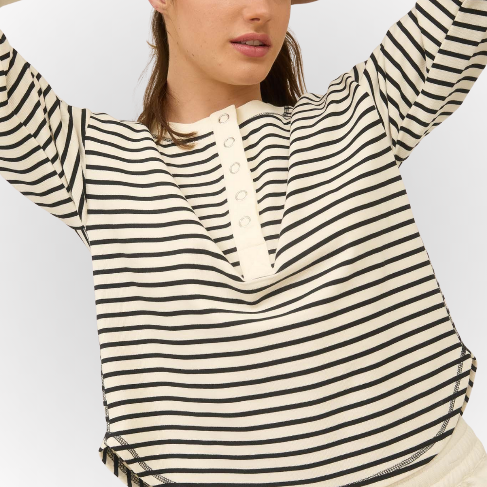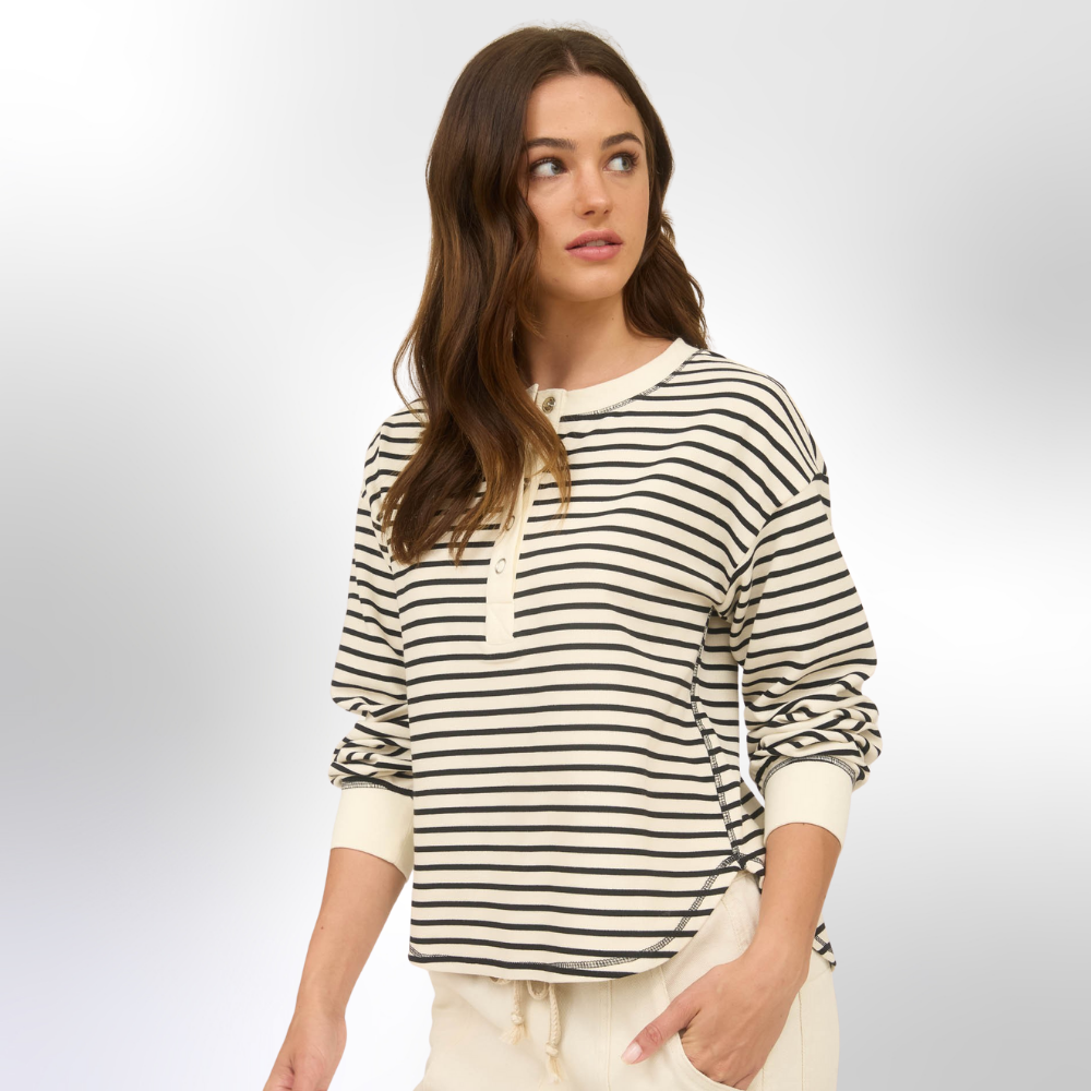 • Style: Stripe Henley Snap Button Long Sleeve Knit Top