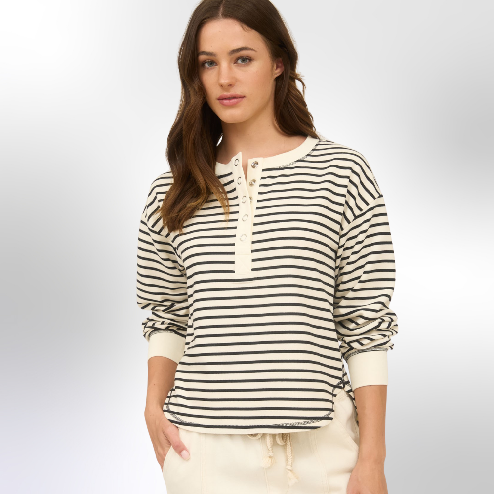 Stripe Henley Snap Button Long Sleeve Knit Top