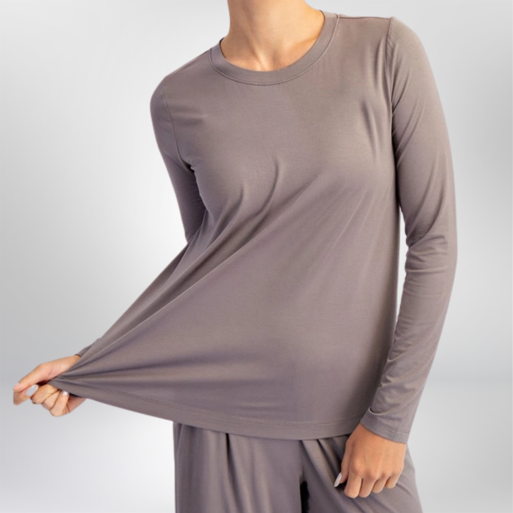 This long sleeve top is all about effortless comfort and cozy style. Made from an ultra-soft viscose modal blend with a touch of stretch, it feels smooth and lightweight—perfect for fall layering or lounging. The relaxed fit makes it easy to wear on its own or pair with the matching wide leg pants for a cute, coordinated set.