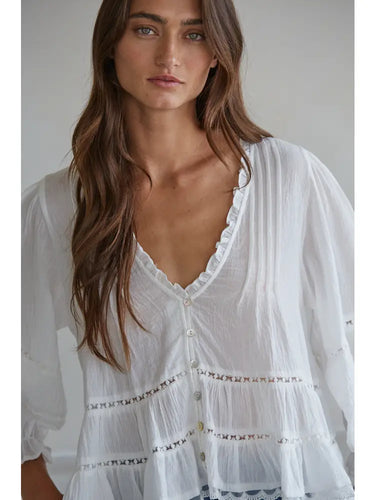 Our Woven Tiered Top has quarter length sleeves and lace trim detail with front buttons. It's light & airy and perfect for warmer weather!