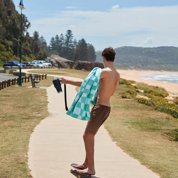 Inspired by shimmering pool water, the Check Mate towel features a wavy checkerboard design in bright aqua and mint hues. This large, quick-dry towel is made from recycled materials and designed for everyday adventures—from poolside lounging to on-the-go getaways.