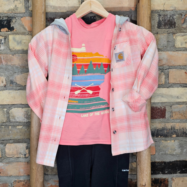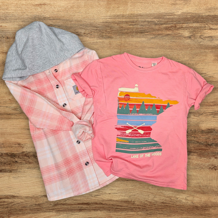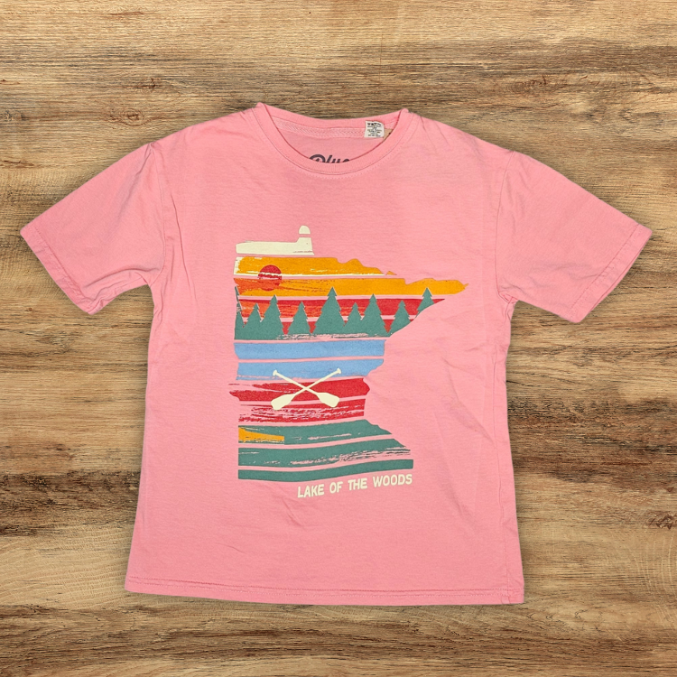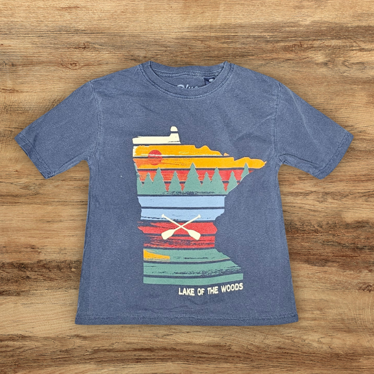 Let the littles rep their favorite up north getaway in this Lake of the Woods kids souvenir tee. Designed with a fun and artistic twist, the graphic is shaped like the state of Minnesota, filled with painted-style stripes that represent land, water, and sky—complete with pine trees and crossed canoe paddles to bring the scene to life. Below the graphic, it reads Lake of the Woods, grounding it in one of Minnesota’s most beloved northern destinations.
