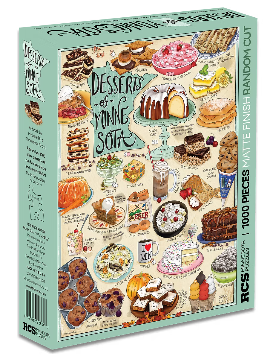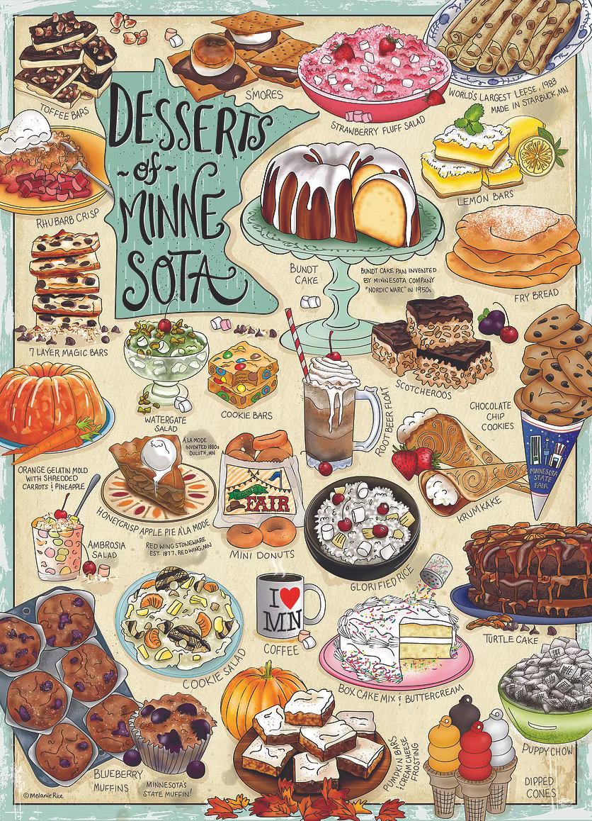 Puzzle your way through beloved desserts Minnesotans grew up eating—like scotcheroos, bundt cakes, pies, bars, and other classics served at church potlucks, family reunions, county fairs, and straight from grandma’s or mom’s recipe box—this puzzle is a treat for the eyes and heart.