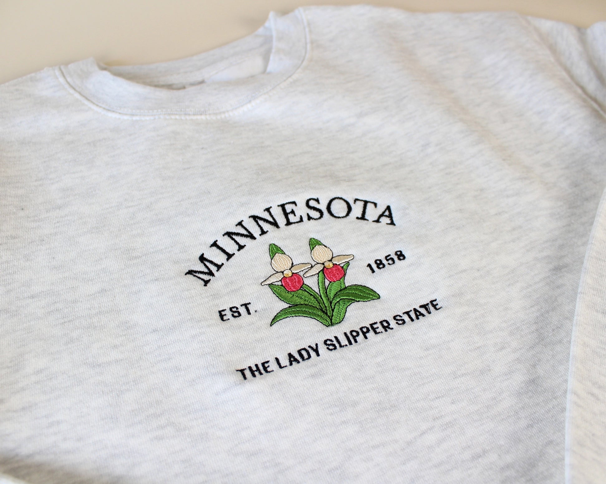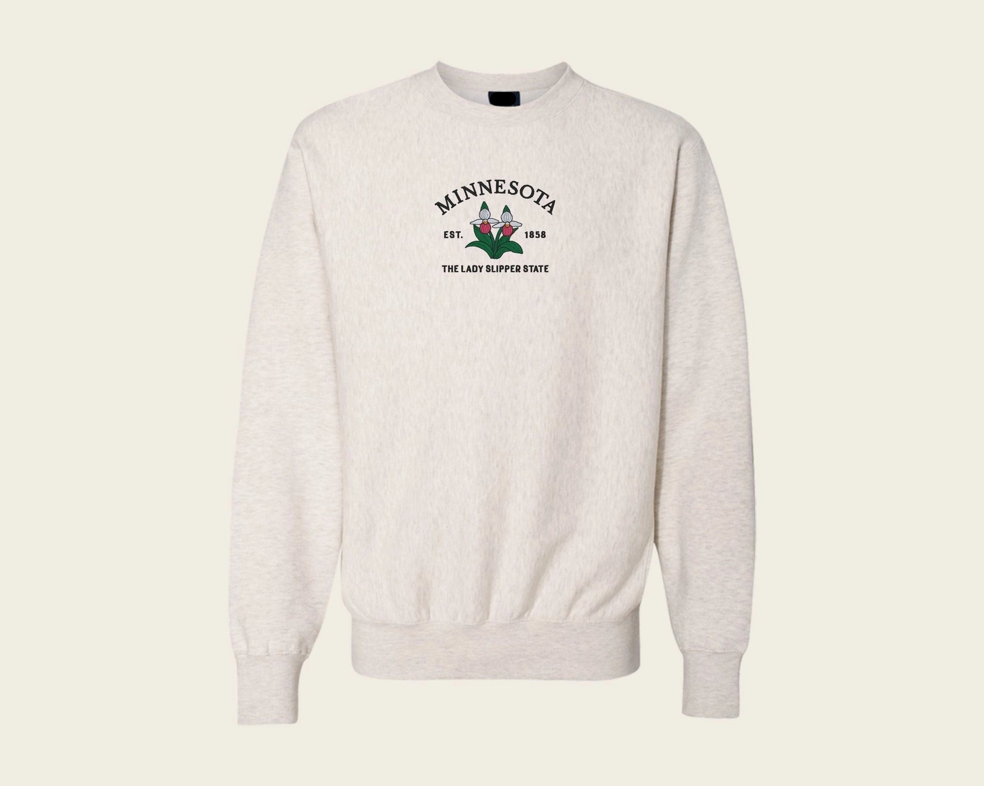 Inspired by the forests of Minnesota, this embroidered crewneck features a delicate design showcasing the state unique state flower, the pink and white lady slipper.