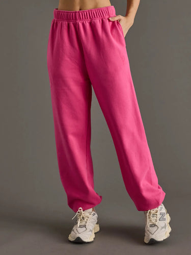 Bright Pink Sweatpants featuring a relaxed fit with an elastic waistband, side pockets, and ribbed ankle cuffs for a cozy, laid-back style. Complements the matching Bright Pink Hooded Sweatshirt for a coordinated and comfortable look.