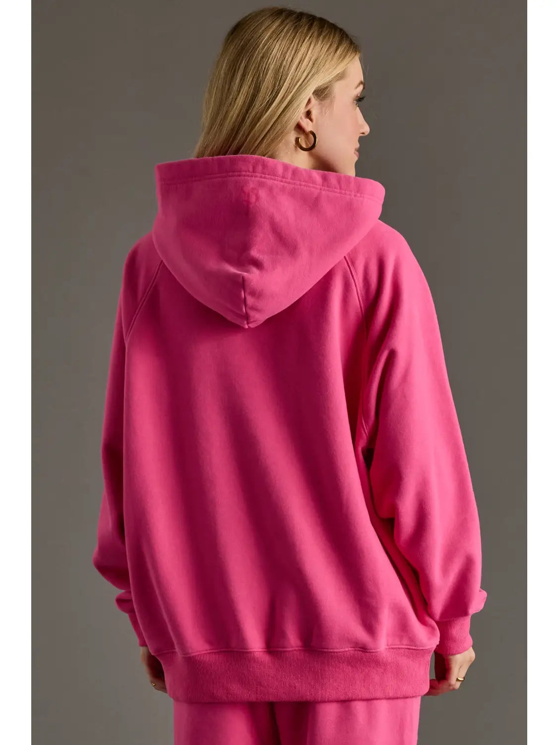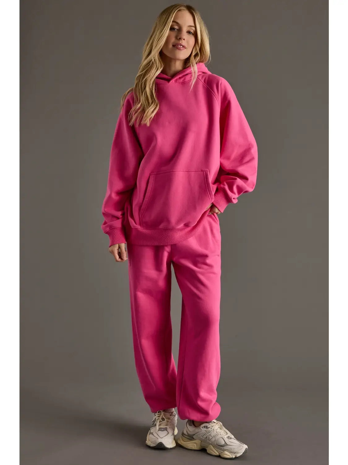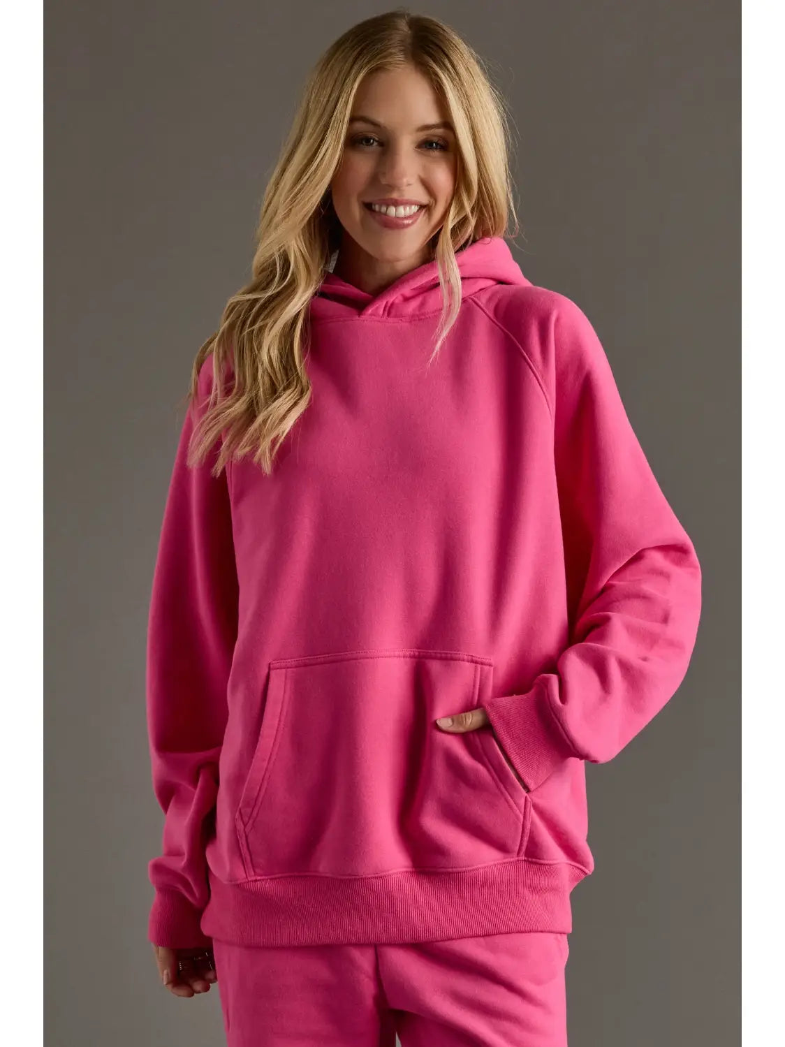 Bright Pink Hooded Sweatshirt featuring a relaxed fit with a cozy fleece interior, front kangaroo pocket, and ribbed cuffs and hem for casual comfort. Pairs perfectly with the matching Bright Pink Sweatpants for a coordinated, laid-back look.