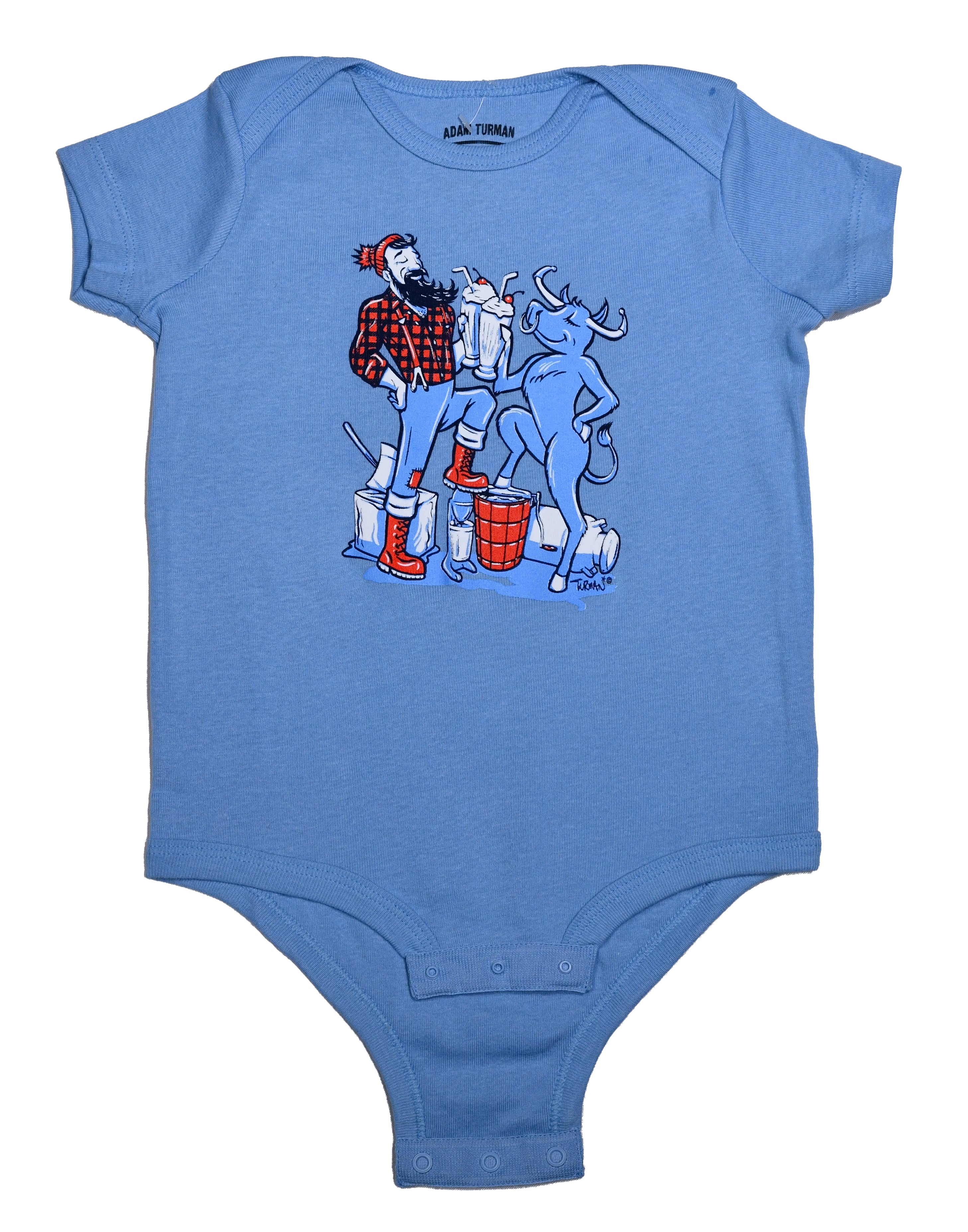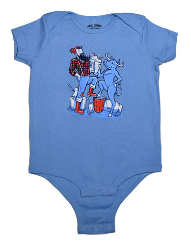 Introduce your little one to Minnesota legends with a playful twist! The Paul & Babe Cheers! Milkshake Onesie features Paul Bunyan and Babe the Blue Ox clinking milkshakes instead of beers—because even legends know how to keep it kid-friendly. Printed on a soft, light blue short-sleeve bodysuit, this onesie is available in three sizes and combines local charm with everyday comfort. A fun and unique baby gift for Minnesota families or anyone who loves a touch of folklore with their baby gear.