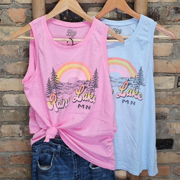 Available in two worn-in, summery shades—hot pink and powder blue—each features a playful “Rainy Lake” script and a stylized sun in faded pink, yellow, and orange hues. The look is subtle, sun-kissed, and unmistakably lake-ready.